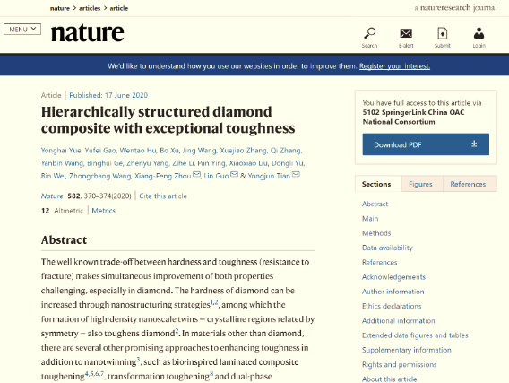 2020年6月18日,Nature杂志在线全文发表了pp电子游戏官网郭林教授、岳永海教授团队与燕山大学田永君院士团队在纳米孪晶复合金刚石增韧机制方面的最新研究成果:“Hierarchically structured diamond composite with exceptional toughness”。岳永海教授、高宇飞博士、胡文涛教授、徐波教授为文章共同第一作者,周向峰教授、郭林教授、田永君院士为共同通讯作者。