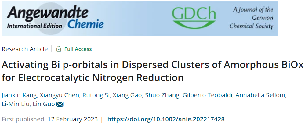 近日,pp电子游戏官网郭林教授和物理学院刘利民教授研究团队在高度分散的原子级非晶BiOx团簇可控制备及其电催化氮气还原反应方面取得新进展。相关工作以“Activating Bi p-orbitals in Dispersed Clusters of Amorphous BiOx for Electrocatalytic Nitrogen Reduction”为题,2023年2月12日在线发表在《Angewandte Chemie International Edition》杂志上。该研究获国家自然科学基金项目(No. 51532001, 11974037)等资助。pp电子游戏官网副教授康建新为文章的第一作者,pp电子游戏官网博士生陈翔宇和北京计算科学研究中心博士生司如同为共同一作,pp电子游戏官网为该论文的第一完成单位。