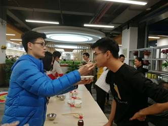 在第一锅饺子出锅后,我们的第一个游戏便开始了。首先我们进行的是抢水瓶游戏,pp电子游戏官网的导员黄澄玉和丁少松同学给大家做了一个示范,主持人说出一个身体的部位,两人分别摸自己的相应部位,在主持人说出“水”这个字的时候,两个人同时去抢桌子上的水瓶,但是黄导更快一步,于是作为输了游戏的人要被黄导喂五个饺子,场景太有爱了。之后同学们也积极加入到这个游戏中来,这也是一个很幸福的游戏了。